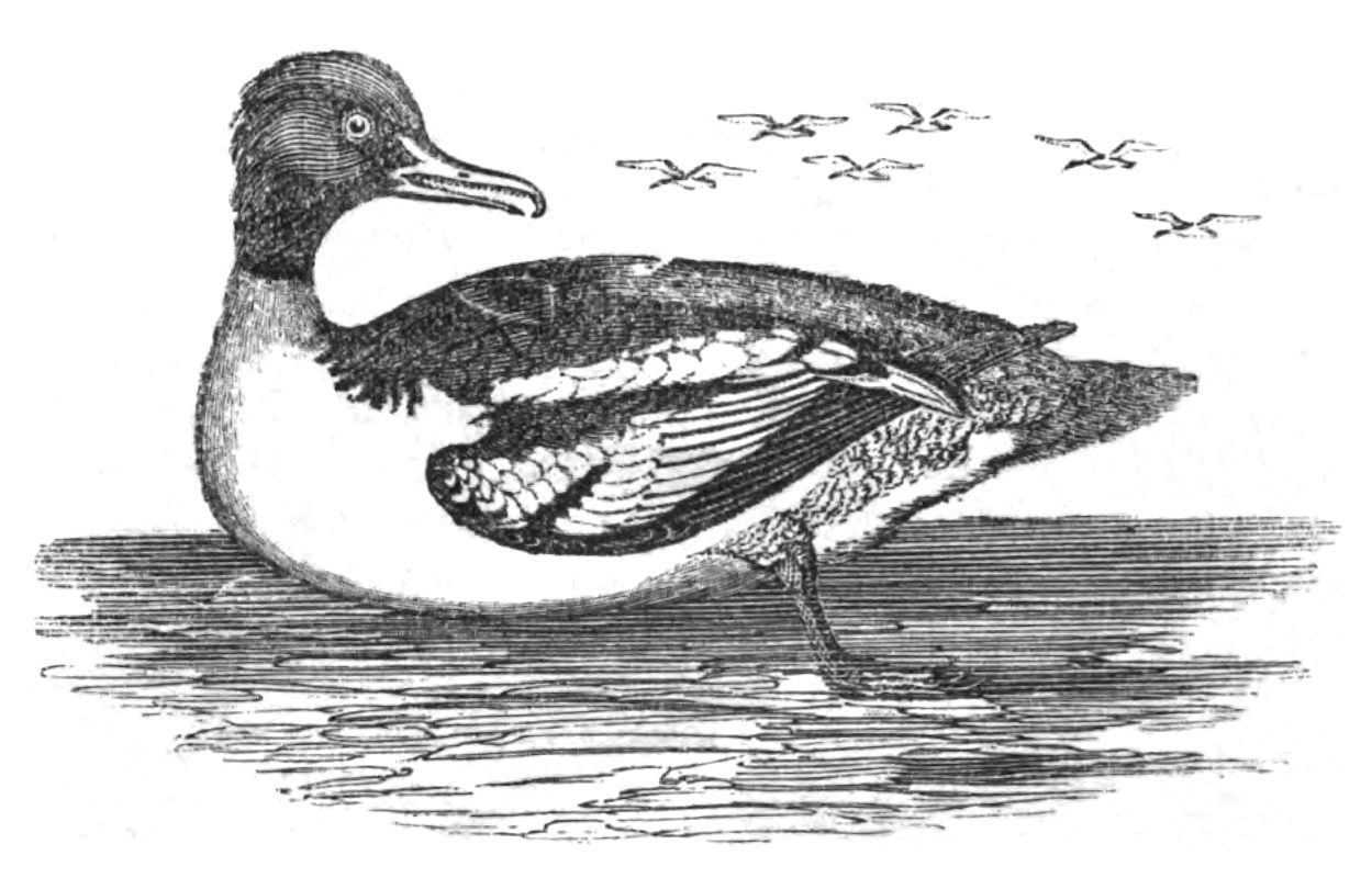 He is a winter inhabitant of the States; is found on the seas, fresh water lakes and rivers, and bears many different appellations, such as the Water Pheasant, the Sheldrake, the Fisherman, and the Diver. The name Goosander is a popular misnomer, because no one of all the nine species of the genus Mergus has either the appearance or the habits of geese of any description. They have the bill rather longer than the middle size, and much more slender and hard in its texture than the bills of ducks, not being a dabbling or sentient bill like theirs, but prehensile and of a very peculiar form. The mandibles are straight for a greater part of their length, but the upper one is much hooked at the point, and very sharp, and the cutting edges of both mandibles are in all their length beset with short, but strong and sharp teeth inclining backward. The bill is thus fitted for taking a very firm hold of slippery prey, and its skill in capturing fish proves how effective is this simple apparatus. The Goosander, from having its legs far backward, is an awkward walker, while it does not dive so well as the proper diver, yet, by the arrangement of its bill, it is enabled to levy far more severe contributions upon fish-ponds than any birds which resort to such places, not even excepting the herons. Their wings are of moderate length, but clean and firmly made, and the plumage of the body is also firm and compact, so that the power of flight is considerable, and when necessary it can be extended to long distances without much fatigue. As is the case with the ducks, there is an enlargement of the pulmonic end of the trachea, which probably answers the purpose of a magazine of air, and enables the birds to remain much longer under water than they could do if not thus provided. The general color of the bill is red; but a portion round the nostrils, the ridge of the upper mandible, and the nail on its tip are dusky. The inside of the gape is bright orange; the head and the crest, the last of which is most conspicuous in the male, together with the upper part of the neck, are dark green, passing into black on the chin and throat; the lower part of the neck, the outer scapulars, the breast, and all the under part of the body, are white, with a tinge of yellowish-red. The back and the scapulars next the back are black, fading into grayish toward the rump; and the tail, which consists of eighteen pointed feathers, is of a gray color. The principal quills and coverts are brownish-black, with the exception of the middle secondaries and the extremities of their coverts, and these form a white speculum or wing-spot. The head and neck of the female are rust color, the upper part is of a grayish tint, and the under part white, with a yellowish shade. In consequence of this she has been figured and described as the Dun Diver; and the young male, which resembles her in color, has been considered as the male of the same. The bill and feet are reddish ash color. The accurate observations of Wilson, Nuttall, and others, have proved beyond a doubt the true character of the Dun Divers, and the unfortunate Goosander, whom the English discoverers of the latter bird had deprived of any consort, has been again restored to his legitimate rights.