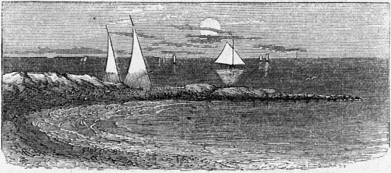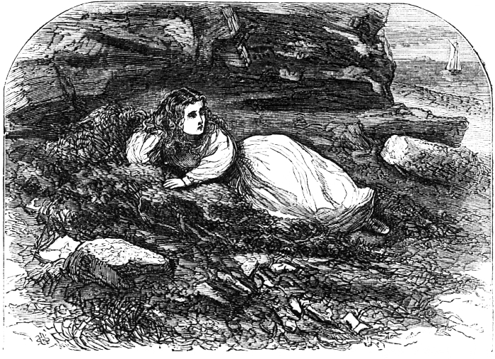 Alas! need I tell of the wild search that followed?—of the white-haired grandparents flying hither and thither with heart-rending cries?—of the fearful suspense, reduced to still more cruel certainty after long days of fruitless search? The turbulent waters sank to their level again, the blue waves kissed the white sands, and the rocks rose brown and warm in the sunlight; but never again was seen the little golden-haired figure flitting among them, or nestling in the dry sea-weed. A few months after the broken-hearted grandparents were gathered into God’s Acre, a tortoise-shell comb was found in a crevice of the rock under the boulder; and, to this day, yarn-loving old fishermen protest they hear at times the strangest kind of music around the red-house cliffs.