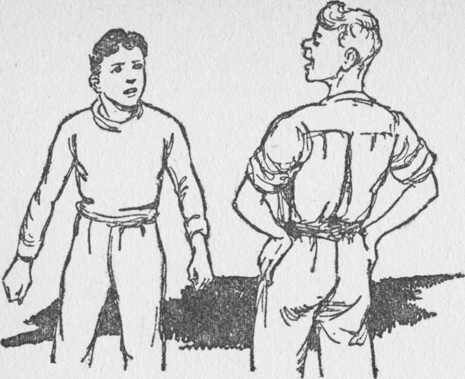 Larry sprang at Dick, and hit him straight in the face. It was a heavy blow, and poor Dick staggered back, his lip bleeding. Larry came at him again, and Dick put up his fists, knowing that he had a very poor chance against Larry, who was bigger than he was, and much stronger.