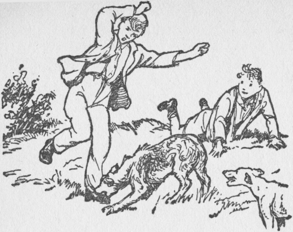 And now, what was happening to Larry, Dick, and the dogs? Well, Larry had gone at a very good pace, all the dogs following excitedly at his heels. Into the heathery hills he went, and then sent the dogs in all directions by shouting, “Rabbits! Get them then! Rabbits!”