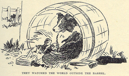 Jessie looked up at her master with her great brown eyes and waved her feathery tail. She was a beautiful sheep-dog, a clever collie who knew every inch of the hills around. For a little while she was having a rest from her work, and was looking after her family of puppies. They were nearly three weeks old, and all of them could see now. They had been born with their eyes shut, but one by one their blue puppy-eyes had opened, and now they watched the world outside the barrel, and wondered about it.