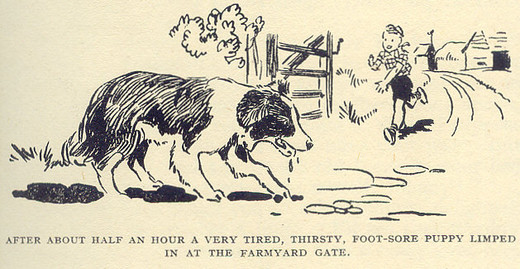 AFTER ABOUT HALF AN HOUR A VERY TIRED, THIRSTY, FOOT-SORE PUPPY LIMPED IN AT THE FARMYARD GATE.