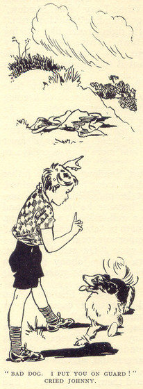 And after about half an hour a very tired, thirsty, foot-sore puppy limped in at the farmyard gate. How good it was to be back! There were the hens. There was the duck-pond—and there was dear old Johnny! With a whine the puppy ran limping over the yard—and Johnny stared at him in the utmost astonishment.