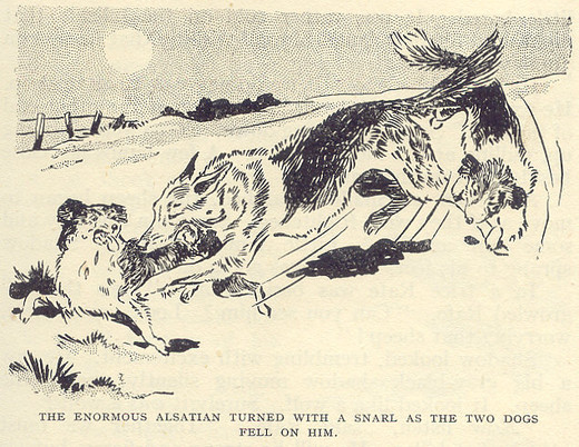 The first eagle dropped down again, trying to strike at the boy’s head—but with a magnificent leap Shadow jumped six feet into the air and snapped at the cruel legs. His strong teeth closed over them and he gave the bird such a bite that it yelped in pain and anger. Shadow’s mouth was torn and bleeding, but the dog did not even notice it.