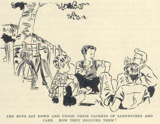 Johnny made himself some cheese sandwiches and boiled a tin kettle over a fire he made. He was soon munching his sandwiches and drinking hot tea, and thinking that never had food tasted so nice before!