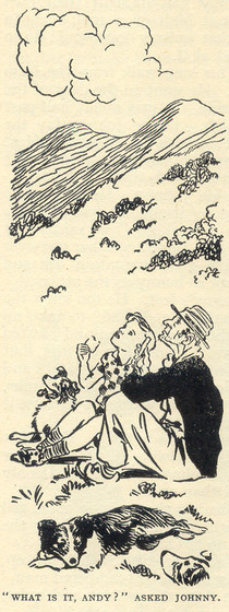 Shadow lay down at Johnny’s feet. He too knew the weakling lambs, for they had been difficult to take up the mountain. Too often they had stopped and bleated pitifully. Their mothers waited for them at first, but after a while they became tired of the bleating lambs and took no notice. Then the dogs had to send on the lambs, and Shadow got very cross with one youngster because it would keep running the wrong way.