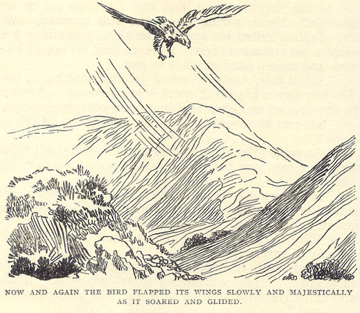Johnny stood watching the soaring bird. It came down lower on its outspread wings. They were really enormous wings, and the tips turned upwards, the feathers spread out like fingers against the sky. Now and again the bird flapped its wings slowly and majestically as it soared and glided.