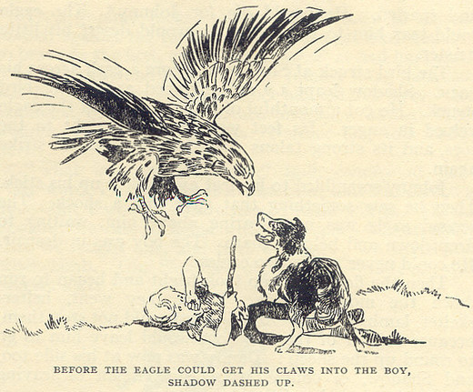 Shadow growled so deeply and so fiercely that even the eagle was alarmed. The dog bared his great teeth and snarled. He would die for Johnny! The eagle could tear him to bits before he would desert his little master.