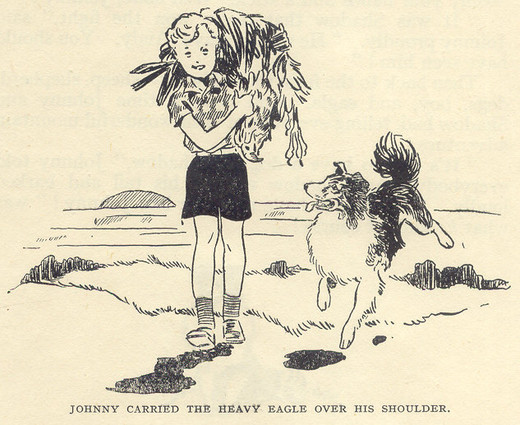 Then Johnny picked up his stick ready to defend himself against the eagle’s mate. But that bird was not so brave as the first, and when it saw what had happened it soared away and disappeared. Johnny flung back the wet hair from his forehead and blinked his eyes. He examined both dogs in silence and then bathed their wounds in the pool nearby. Neither dog was badly hurt.