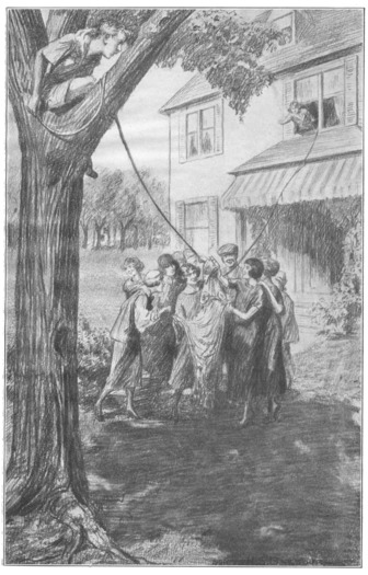 His eyes and thoughts were fixed upon a large elm tree which grew close to the sidewalk some yards distant across the lawn. The tree was stately, as only an elm knows how to be, its tall, thick trunk being free of branches to a point almost level with the roof of the house. At that height great limbs spread out over the sidewalk and shaded a large area of the Harris lawn. Pee-wee studied this tree with the critical eyes of an engineer.