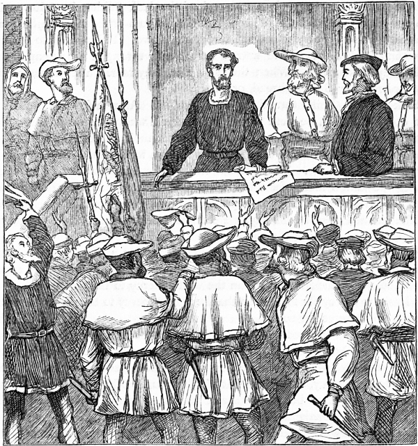 “Your Majesty has seen,” he said, “that water atoms can break iron, and are, in fact, ‘giants in disguise.’ We have seen, also, that they are orderly giants, and, at the word of command, fall into stars and sprays, as the soldiers of your Majesty’s regiments fall into line. Now we have the water atoms and our old friend Heat here in this furnace. He is at his usual work,—fighting with cohesion, and pushing the water atoms apart. Cohesion presses down with all its weight, but Heat is quite strong enough to lift it. Then the water atoms spring apart in fine steam particles. The water needs now much more room than it did in the beginning. The water atoms are greatly heated, that is, they are in furious motion, and are stretching and pushing for more room; and once more we see here that Heat is Force. This water, which would yield to the finger when cold, is now strong. It whirls, and spins, and presses so hard, that, if there were no spout through which it could escape, and the cover of the kettle were fitted tight, it would burst the kettle. These atoms, your Majesty, will push and drag tons. They will saw, and grind, and punch, and plane stone and iron. They—”