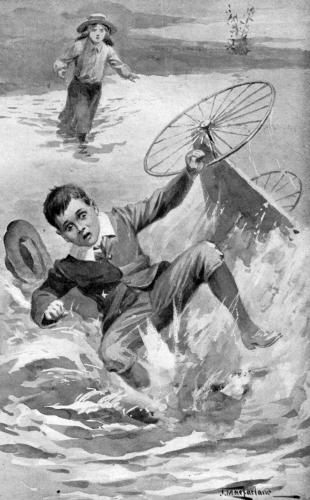 Hogg’s sworn foe was Lee Wing, the Chinese gardener, who reigned supreme in the orchard and the kingdom of vegetables—not quite the same thing as the vegetable kingdom, by the way! Lee Wing was very fat, his broad, yellow face generally wearing a cheerful grin—unless he happened to catch sight of Hogg. His long pigtail was always concealed under his flapping straw hat. Once Jim, who was Norah’s big brother, had found him asleep in his hut with the pigtail drooping over the edge of the bunk. Jim thought the opportunity too good to lose and, with such deftness that the Celestial never stirred, he tied the end of the pigtail to the back of a chair—with rather startling results when Lee Wing awoke with a sudden sense of being late, and made a spring from the bunk. The chair of course followed him, and the loud yell of fear and pain raised by the victim brought half the homestead to the scene of the catastrophe. Jim was the only one who did not wait for developments. He found business at the lagoon.