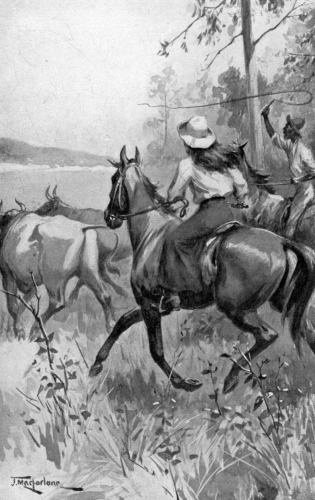 She had no little girl friends, for none was nearer than the nearest township—Cunjee, seventeen miles away. Moreover, little girls bored Norah frightfully. They seemed a species quite distinct from herself. They prattled of dolls; they loved to skip, to dress up and “play ladies”; and when Norah spoke of the superior joys of cutting out cattle or coursing hares over the Long Plain, they stared at her with blank lack of understanding. With boys she got on much better. Jim and she were tremendous chums, and she had moped sadly when he went to Melbourne to school. Holidays then became the shining events of the year, and the boys whom Jim brought home with him, at first prone to look down on the small girl with lofty condescension, generally ended by voting her “no end of a jolly kid,” and according her the respect due to a person who could teach them more of bush life than they had dreamed of.