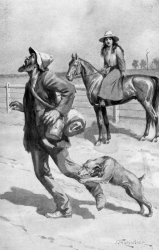 Puck used to come on these excursions too. He was the only being for whom it was suspected that Tait felt a mild dislike—an impudent Irish terrier, full of fun and mischief, yet with a somewhat unfriendly and suspicious temperament that made him, perhaps, a better guardian for Norah than the benevolently disposed Tait. Puck had a nasty, inquiring mind—an unpleasant way of sniffing round the legs of tramps that generally induced those gentry to find the top rail of a fence a more calm and more desirable spot than the level of the ground. Indian hawkers feared him and hated him in equal measure. He could bite, and occasionally did bite, his victims being always selected with judgment and discretion,—generally vagrants emboldened to insolence by seeing no men about the kitchen when all hands were out mustering or busy on the run. When Puck bit, it was with no uncertain tooth. He was suspected of a desire to taste the blood of every one who went near Norah, though his cannibalistic propensities were curbed by stern discipline.