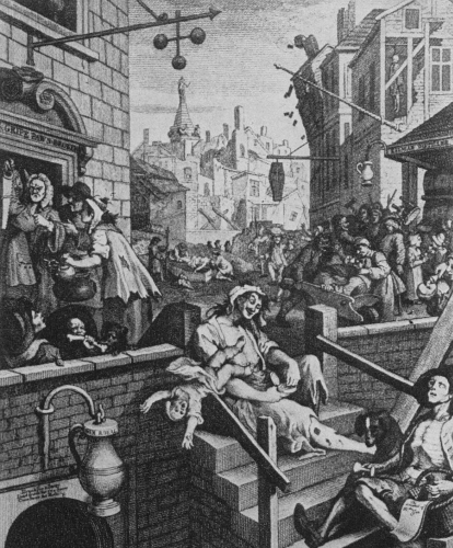 Gin Lane by Hogarth. Over the door of the public-house called the Gin Royal in left foreground: ‘Drunk for a Penny, Dead Drunk for Two Pence, Clean Straw for Nothing.’ The ballad being sold by the cadaver in right foreground is marked: ‘The Downfall of Mdm. Gin.’ The drunken poxed lady takes snuff and drops her baby. A slothful couple gnaw a bare bone with a dog, while a snail crawls to the woman’s shoulder. At S. Gripe’s pawnshop, a carpenter pledges his tools, a housewife her cooking things. The tipsy old woman in the wheelbarrow is having one for the road. A mother gives her infant a drink: two charity-girls are toasting each other opposite Kilman the Distillers’ where the Mob queues for gin: two drunks fight with crutch and stool: a dancing madman with a bellows has transfixed a naked child with a spit: a barber has hanged himself in a garret: a dead woman is being coffined while her baby weeps, opposite the undertaker’s: the houses are falling down: rather a nice dog is feeling sorry for the ballad-seller. Written beneath: