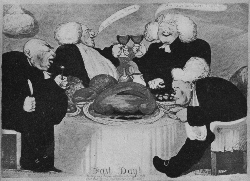 Fast Day by Newton. One cleric observes: ‘Here’s to our old Friend.’ To which the other replies: ‘You mean the Church I suppose.’ Underneath is written: