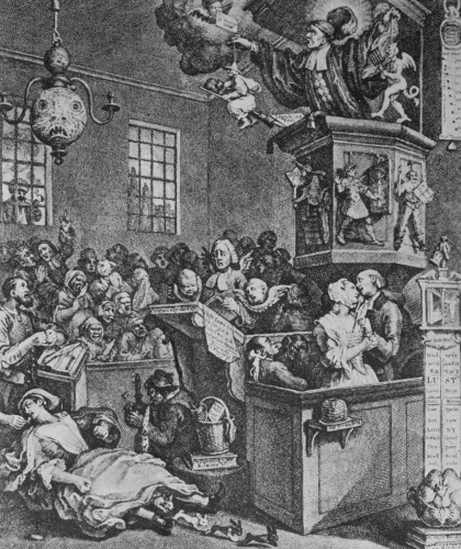 Credulity, Superstition and Fanaticism by Hogarth. On the chandelier, top left: (upper globe) ‘Deserts of New Purgatory’; (lower globe) ‘A New and Correct Globe of HELL by Romaine. Lead Lake. Pitch and Tar Rivers. Bottomless Pit. Horrid Zone. Parts Unknown. The Brimstone Ocean. Eternal Damnation Gulf.’ The Preacher, dangling puppets of witch and demon, inspired by a cherub whose placard says ‘To St. Money-trap’, is so excited by his own oratory—which has cracked the sounding board—that his wig flies off, showing a Jesuit’s tonsure and his gown flies open, showing the actor’s harlequin dress. His fervour is measured by a kind of thermometer on right, hanging from a human nose and graded from ‘Natl. Tone’ up ‘W - d’s scale of Vociferation’ to the ‘Bull Roar’ of ‘Blood, Blood, Blood, Blood’. From the pulpit hang images of Sir Geo. Viliers, Mrs. Veal and (?) Caesar’s Ghost. The clergyman’s text is ‘I speak as a Fool’. His dissenting clerk, whose desk is inscribed ‘Continually do cry’ looks sidelong at a couple of lustful lovers in the pulpit pew, while the hymn on his desk reads: ‘Only Love to us be giv’n, Lord we ask no other Heav’n. Hymn by G. Whitfield page 130.’ The congregation nurses images of the Virgin with candles. A female devil whispers in the sleeping ear of one. A Jew with ‘Bloody’ written on his knife cracks a flea. A charlatan shoeblack spews up rusty nails; his basket, resting on ‘Demonology by King James 1st’, contains ‘Whitfield’s Journal’. The ‘Poors Box’ is a mousetrap. In the right foreground another thermometer, resting on Wesley’s Sermons and Glanvil on Witches, rises out of the human brain from Suicide through Lust to Raving Madness. It is surmounted by the figures of two ghosts—the cock-lane ghost with her hammer, and the Tedworth drummer. Outside the window an Infidel Turk smokes philosophically while he watches the goings-on. In the foreground, Mary Tofts gives birth to a litter of rabbits. This woman, a native of Godalming (1701-63) ‘declared that she had been frightened by a rabbit while at work in the fields’. She convinced the local apothecary and also a royal surgeon that she had given birth to 15 rabbits. Another royal surgeon seemed doubtful, and she was finally exposed as a cheat, after much excitement, by Sir Richard Manningham. She was imprisoned in 1740 for receiving stolen goods, after having attracted the attention of Hogarth (twice), Voltaire, William Whiston, Sir Hans Sloane, Pope, the King and the entire British nation.