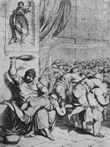 Westminster School, by Gillray. This is a political cartoon of Fox punishing the Opposition in Parliament (Westminster). Pitt, the victim, cries, ‘O pardon me & I’ll promise you on my honor that I will Honestly & boldly endeavour to reform . . .’ Fox replies: ‘That’s all Twaddle!—so here’s for your India Task! there! there! there! & there’s for your blocking up the old Women’s Windows & making them drink Tea in the dark! there! there! & here’s for . . . O I’ve a a a hundred accounts to settle, there! there! there! there! there! there!’ In the background a member of the opposition exclaims: ‘Pray forgive us this once and we’ll do so no more!!!’ Underneath is written: