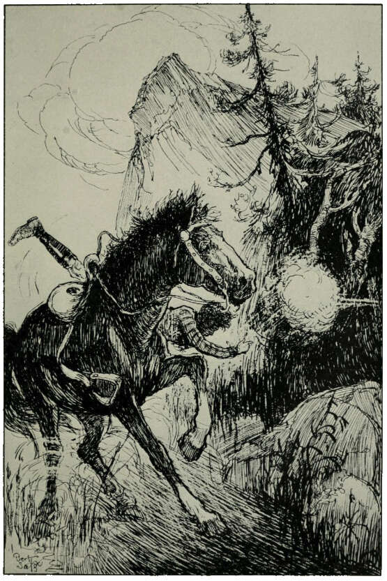 Mac smiled drowsily and was sound asleep by the time Hal had stepped out on the trail. A small terrace of shale marked one end of Mr. Meggle’s property and he sat down upon it to wait. Soon he heard the welcome sound of a horse and his heart skipped a beat or two when Fogarty came into sight.