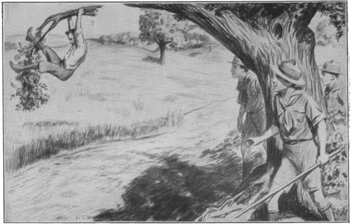 I saw the way he was going to do. He went across the lawn back of the house into the woods; he went away from the road over toward the west. Over that way the woods went up a hill. One sure thing, the ground wouldn’t be wet up there. Then when he got up on the high land he was going to go north and come back to the road again about where the rallying field was. That would be past the place where the tar was. I knew if he did that they would be going through dry woods. Pee-wee is a good little scout all right, only he looked awful funny marching away into the woods with all those girls after him. “He’s leading them to victory,” that’s what I said.