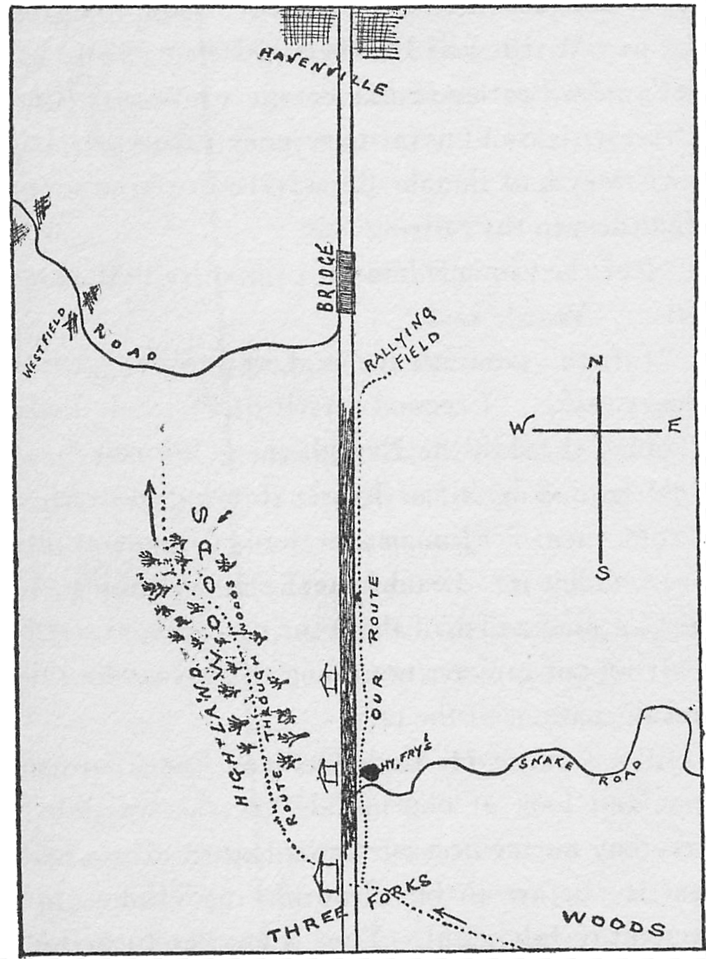 That was all high land and it was the way Pee-wee and those girl scouts went. If you look along on the east side of the road in the place where it’s all tar, you’ll see where it says our route. That’s the way Warde and Dinkey and I went. And believe me we got good and wet up to our knees too. Those girls could never have gone that way. It’s good they had Buffalo Bill Harris for a scout to lead them to the rallying field.