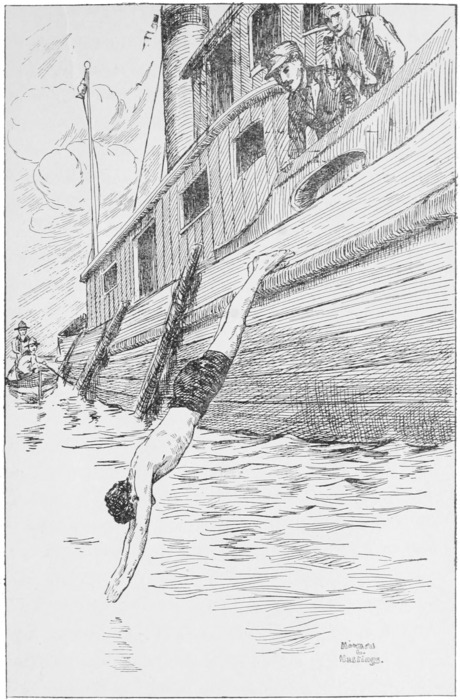 “We can’t find the key-bar, but about a month ago, the old key-bar fell in the river, and I know where it is. Maybe you think I’m crazy, but I’ll dive and get it for you, if you’ll only promise not to tell on Uncle Jimmy, because he couldn’t help going. Maybe you don’t understand, but he just couldn’t. I’ve got the swimming badge and that’s for diving too. All you have to do is to give me some rope, so I can take one end of it down and then you can haul it up and the key-bar will be tied to it. You can be dead sure. Because what a fellow has to do, he can do. Only you have to make me the promise first ’cause that’ll help me to do it.”