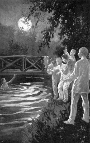 The policeman had said that West House was farther than the school itself and John hesitated at the gate. Then his gaze crossed the road and there was another gate, a rustic one, with the sign “West House” above it. So he turned his back on the school buildings and went through the smaller gate and followed a neat gravelled path that dipped down to a wooden bridge. Above the bridge was an oval pond half an acre in extent. Under and below it a little brook ran, fern-fringed and[15] murmurous, to disappear in a patch of willows and alders beyond. This was the park from which the school took its name. The path led upward again and wound westward through a grove of oaks. Here and there shrubs and plants, their leaves drooping and wilted, lined the path. With the exception of the Public Gardens in Boston, John had never seen anything as beautiful as that far-reaching expanse of turfed ground with the great wide-spreading oak trees throwing their pools of dark green shadow on the grass. There seemed to be no limits to the park, for as far as he could see his vision was shut in by leaf and branch and trunk. Once he thought he spied the top of a red chimney through the greenery, but he wasn’t certain of that. He was certain, however, that Oak Park School exceeded his expectations as far as attractiveness went, and he found so much pleasure in following the path and viewing the new vistas of sun and shade that opened up before him at every turn that he quite forgot his former despondency and was so absorbed that when, quite unexpectedly, the trees stopped and a white cottage with green blinds appeared before him he was quite astounded.