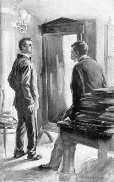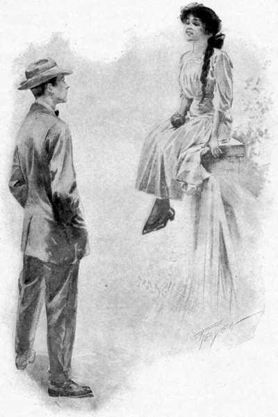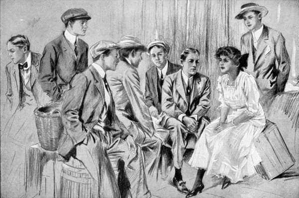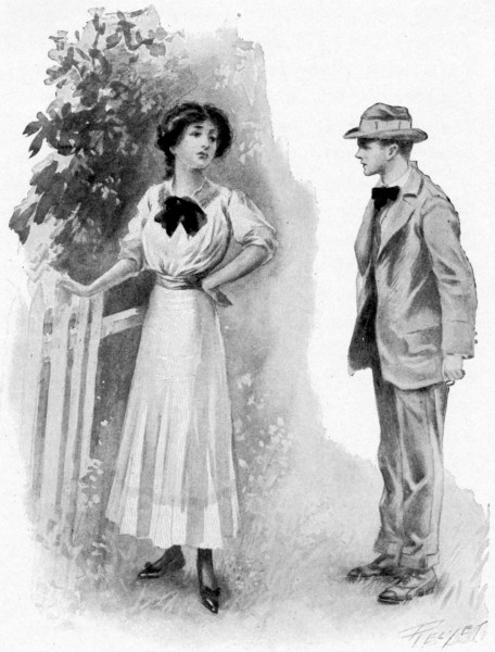 The policeman on duty at the North Woodfield station turned from watching the train disappear westward along the track and gave his attention to the speaker. What he saw was a rather thin youth of fourteen with deeply tanned face from which a pair of gray eyes looked somewhat anxiously upward. The boy had removed his hat, a dilapidated straw adorned with a faded blue band, not out of deference to the majesty of the law but because the September afternoon was decidedly hot, leaving to view a head of pale brown hair, rumpled and damp, which had evidently been trimmed both recently and poorly. He[4] wore a suit of gray flannel, a white shirt, with a stiff and creaky bosom, a narrow red four-in-hand tie and tan shoes. In spite of the fact that his attire was all of the most inexpensive sort he was quite palpably “dressed up” and extremely uncomfortable. He had set down his bag, a small and very shiny contrivance of imitation alligator skin, in order to run a new and scratchy handkerchief around inside his collar.