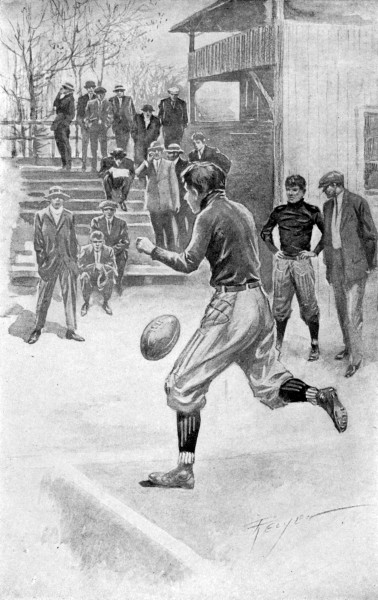 The final game drew many friends of the school to Oak Park that day and the seating accommodations were quite inadequate. Long[370] before two o’clock the gridiron was edged with spectators. On the Hall side, reposing on a little table, lay the Silver Shield, the trophy for the possession of which some forty-odd boys had toiled and moiled day after day for nearly two months. The sun shone brightly and there was almost no breeze when the two teams faced each other for the kick-off, but there was a sharp wintery nip in the air that made the watchers along the lines turn up coat-collars and stamp about. The whistle piped and the final game began.