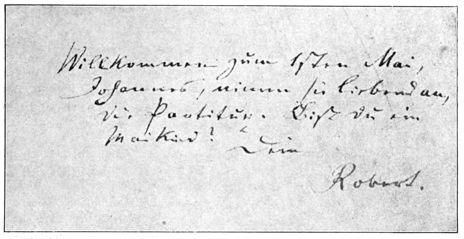 Einmal angeregt, entwickelte sich das junge Genie mit erstaunlicher Schnelligkeit; insbesondere trug hierzu auch ein Besuch in Karlsbad bei, wo das Spiel des damals (1819) dort konzertierenden Moscheles einen unauslöschlichen Eindruck auf den Knaben machte. Schon mit 7 Jahren hatte er sich in kleinen Tänzen, sowie auch in freier Phantasie versucht; so porträtierte er eines schönen Tages auf dem Klavier das Wesen seiner Schulfreunde zu deren freudigster Ueberraschung; es ist, als ob sich hier der Komponist des „Carnaval“ zum ersten Male ankündigte. Gross war die Freude Roberts, als er einen musikalischen Kameraden gewann, mit dem er 4händige klassische Sinfonien, Stücke von Weber, Czerny und Hummel spielen konnte. Ja es gelang ihm sogar, als Gegenstück zu seinem Lesekranz, ein kleines Orchester unter seinen Genossen zusammenzubringen, das er mit wahrem Feuereifer einexerzierte und sogar zur Aufführung eines eigenen Werks, des 150. Psalms für Chor und Orchester, heranzog. Auch in weiteren Bekanntenkreisen liess sich Robert mit glänzendem Erfolg hören, und in Kurzem war das verwöhnte Wunderkind über jede Konkurrenz in Zwickau erhaben.