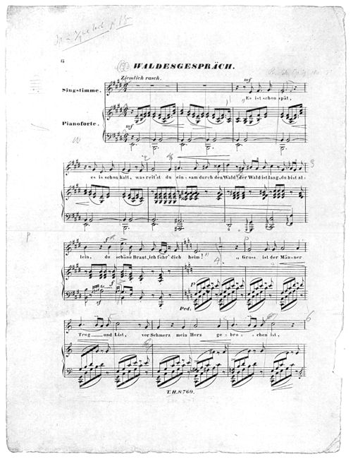 | op. 87. | Der Handschuh. Ballade von F. Schiller für eine Singstimme mit Begleitung des Pianoforte. Leipzig, Whistling. 1850. | ||