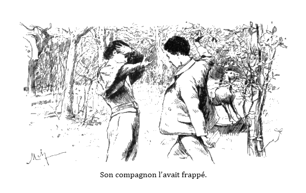 Dans le jardin, Marine se promenait en compagnie du commandant Le Toullec; tous deux regardaient Paul faire une immense partie de cache-cache avec Stop et Mademoiselle. A force de patience, de caresses et de friandises, l’enfant en était arrivé à créer une véritable liaison entre le chien et la guenon. Ayant reporté ses affections sur Paul, le lévrier faisait toutes les volontés du petit garçon. «Mais, au fond, disait Marine, au fond, Stop pense à son maître, je m’en aperçois quand il rêve.»