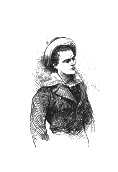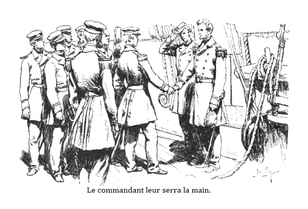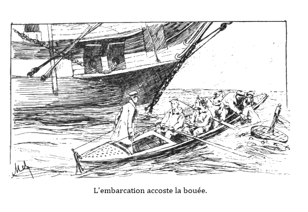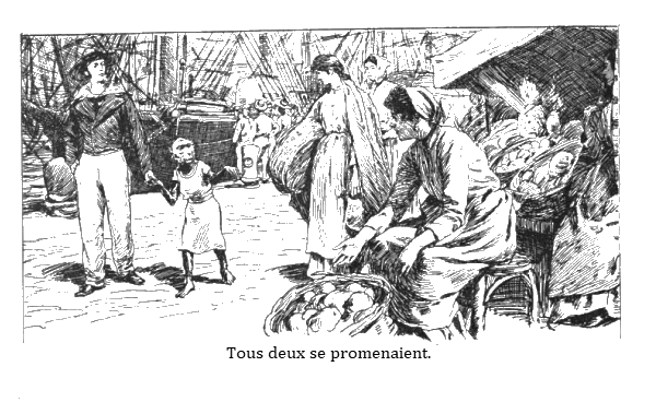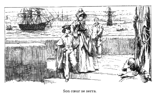 Le monsieur portait la petite tenue des officiers de marine; grand, mince, l’air robuste et distingué, il avait la figure hâlée et une épaisse chevelure noire grisonnant déjà aux tempes. La dame, blonde, encore jeune, devait être jolie; mais elle venait de beaucoup pleurer et ses yeux rouges et bouffis la défiguraient entièrement; appuyée au bras de son mari, elle paraissait suivre de bien tristes pensées. Le petit garçon avait aussi versé quelques larmes, larmes déjà séchées sur ses joues roses, et souriant, une main dans celle de son père, il cherchait à découvrir l’objet attendu.