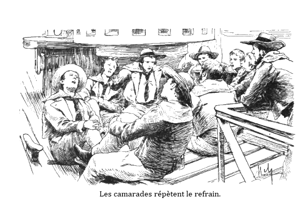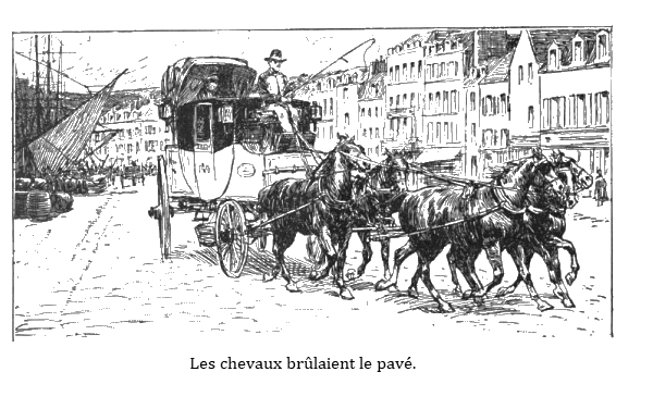 Enfin, en s’essuyant les lèvres, le père Quoniam grimpa sur le petit siège placé à côté du marchepied, «Allons, Pied-Blanc, s’écria-t-il, allons, t’as promis de regagner, et gare aux coupées! t’entends...»