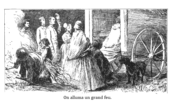 A cet instant, après avoir franchi d’un bond un large fossé, un superbe chien griffon vint tomber devant la carriole. Pied-Blanc et le chien semblaient très joyeux et très excités; l’un modulait la gamme de ses hennissements, grattait la terre avec son sabot et tendait le nez à l’autre qui aboyait, sautait et léchait la tête du petit cheval. Ayant quitté son siège, le père Quoniam causait avec le berger et semblait lui demander un conseil.