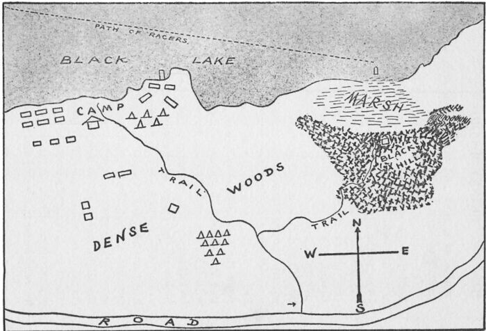 Overlook Cabin had not been built for season occupancy. It had been thrown up as a little storehouse for paraphernalia used on the hill, which was called Black Hill because it rose above a treacherous marsh and overlooked Black Lake. The reader will find helpful the accompanying rough sketch of the locality. Black Hill, as wall be seen, lay to the east of the camp. The slope was gradual from the south where the highroad passed. But on reaching the brow of the hill one looked down from a dizzy precipice.