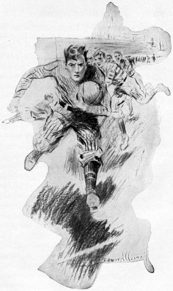 Ahead and at his right sped Vance, tuckered but still game. Behind him weary feet pounded. In his ears was a mighty noise that he knew for the wild, imploring shrieks of friend and foe. Through it came the dull thump, thump! of the bass drum. Twenty yards more now, and the quarter, white-faced and desperate, running toward him with clutching fingers. Then Vance was down, run out, and Myron was alone. Fifteen yards and the Kenwood quarter-back poising for his tackle! Myron gave a little toward the side-line, slackened his pace and then, with a final demand on his strength, sprang forward again at renewed speed. The quarter-back leaped. Myron felt his arms at his hips as he spun on his heel. One arm fell away, but a hand closed inside his leg above the knee and a great weight pulled at him. One plunge, a second, and the last line was swimming in his sight. Then, as if by a miracle, the clutching hand was gone, and, freed of the dragging burden, Myron stumbled, fell to his knees, recovered and went on, straight across the last white line to victory!