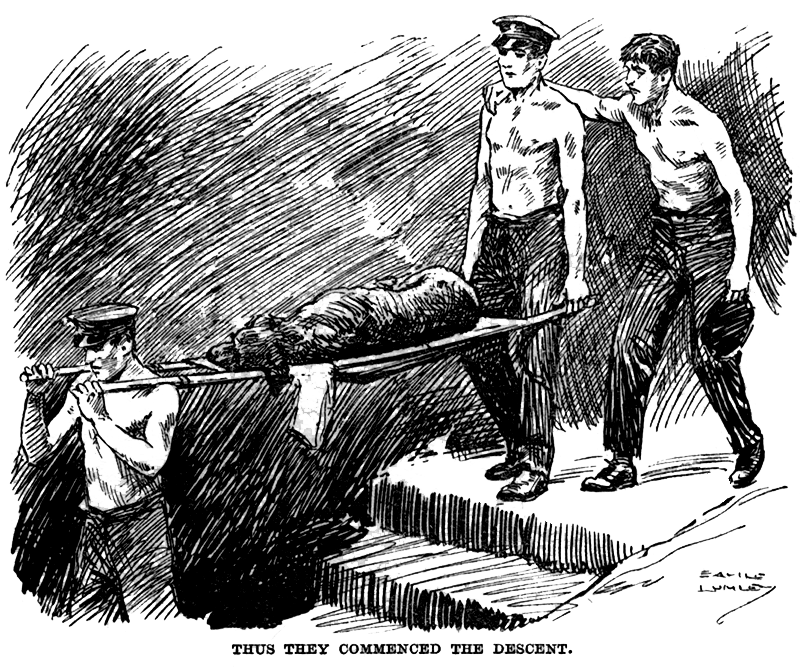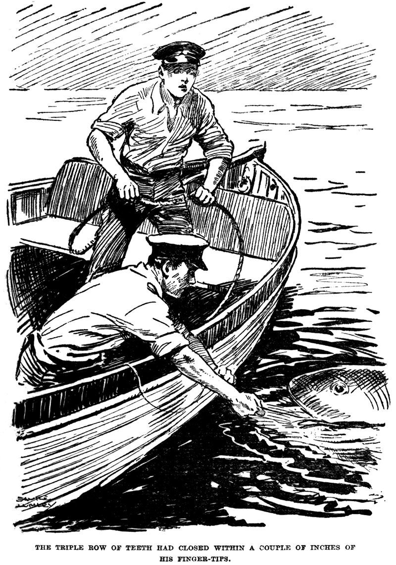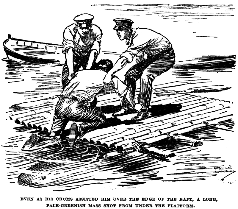 | EVEN AS HIS CHUMS ASSISTED HIM OVER THE EDGE OF THE RAFT, A LONG, PALE-GREENISH MASS SHOT FROM UNDER THE PLATFORM | 58 |