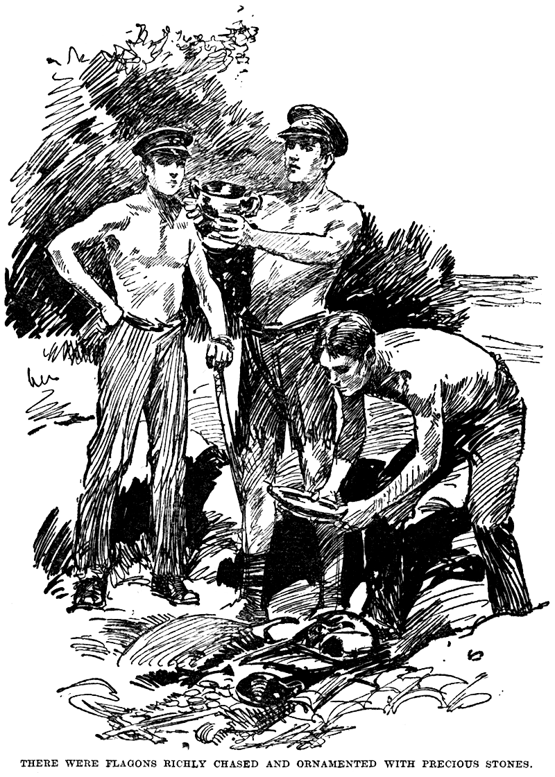 Left to themselves, the boys began to realise that their stay on the island was drawing to a close. Although Captain Tweed seemed perfectly straight, they decided to say nothing about the treasure buried under the floor, nor anything concerning the mysterious subterranean passages under the plateau. They had some of the gold in their belt-pouches.