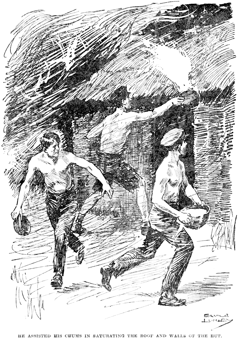 | HE ASSISTED HIS CHUMS IN SATURATING THE ROOF AND WALLS OF THE HUT | 132 |