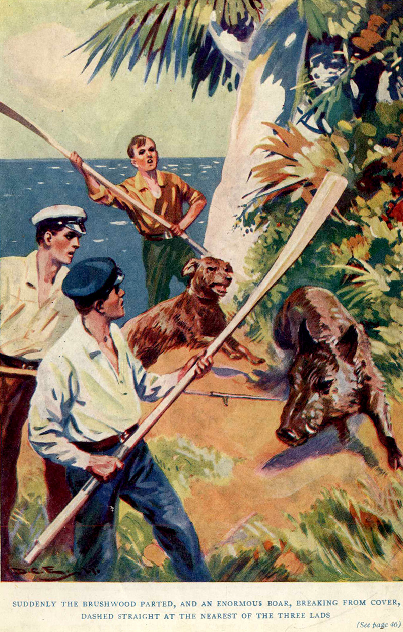 | SUDDENLY THE BRUSHWOOD PARTED, AND AN ENORMOUS BOAR, BREAKING FROM COVER, DASHED STRAIGHT AT THE NEAREST OF THE THREE LADS (See page 46.) | Frontispiece |