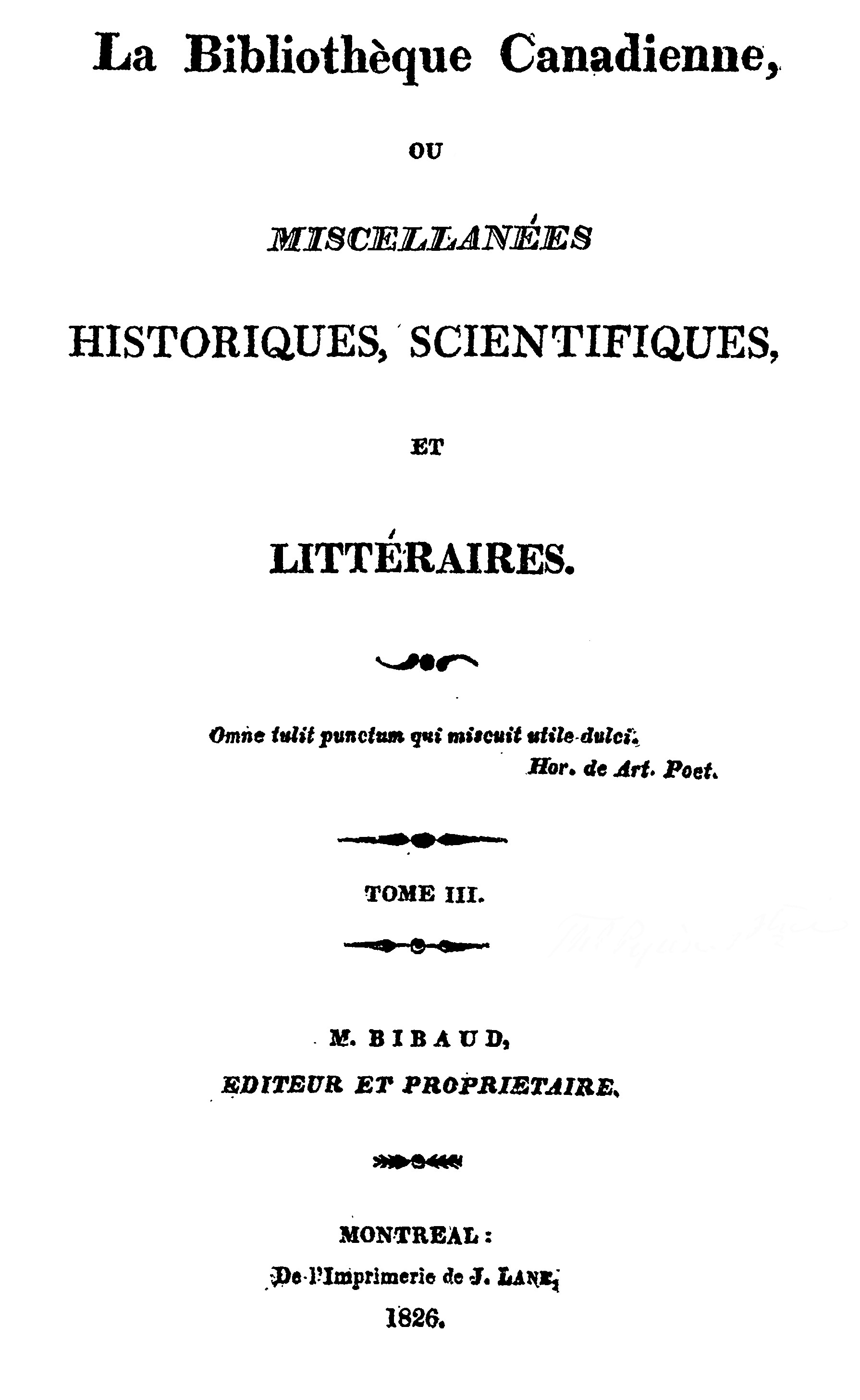 “Monsieur—Depuis quelque tems, je m’apperçois que vous ne mettez plus dans vos Miscellanées l’article que vous intituliez, Regître Provincial, et qui contenait, entr’autres choses, les mariages et décès des personnes notables. Vous avez, sans doute, de bonnes raisons pour ne plus suivre le plan que vous aviez adopté d’abord; mais quelques soient ces raisons, je regretterais, pour ma part, qu’elles eussent prévalu, si en conséquence vous ne pouviez republier dans la Bibliothèque Canadienne, le morceau ci-inclu, qui a paru dans le Spectateur Canadien et ailleurs. Peut-être que des considérations de connaissance et d’amitié pourraient vous faire résoudre à vous écarter, cette fois, de la nouvelle règle que vous paraissez vous être imposée. C’est du moins une faveur que j’ôse attendre de votre part.”