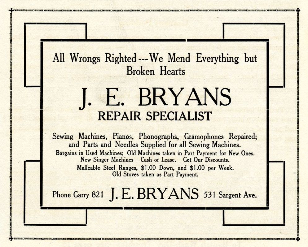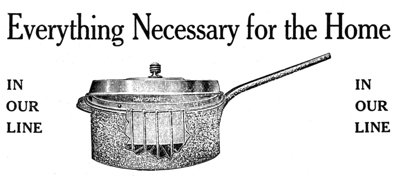 We carry a complete line of Wash Boilers, Tubs, Washboards, Clothes Wringers, Lines, Pins, Wringers, Baskets, and Hampers of all sizes and prices. Ironing Boards, Electric Irons, Mrs. Potts’ Sad Irons.