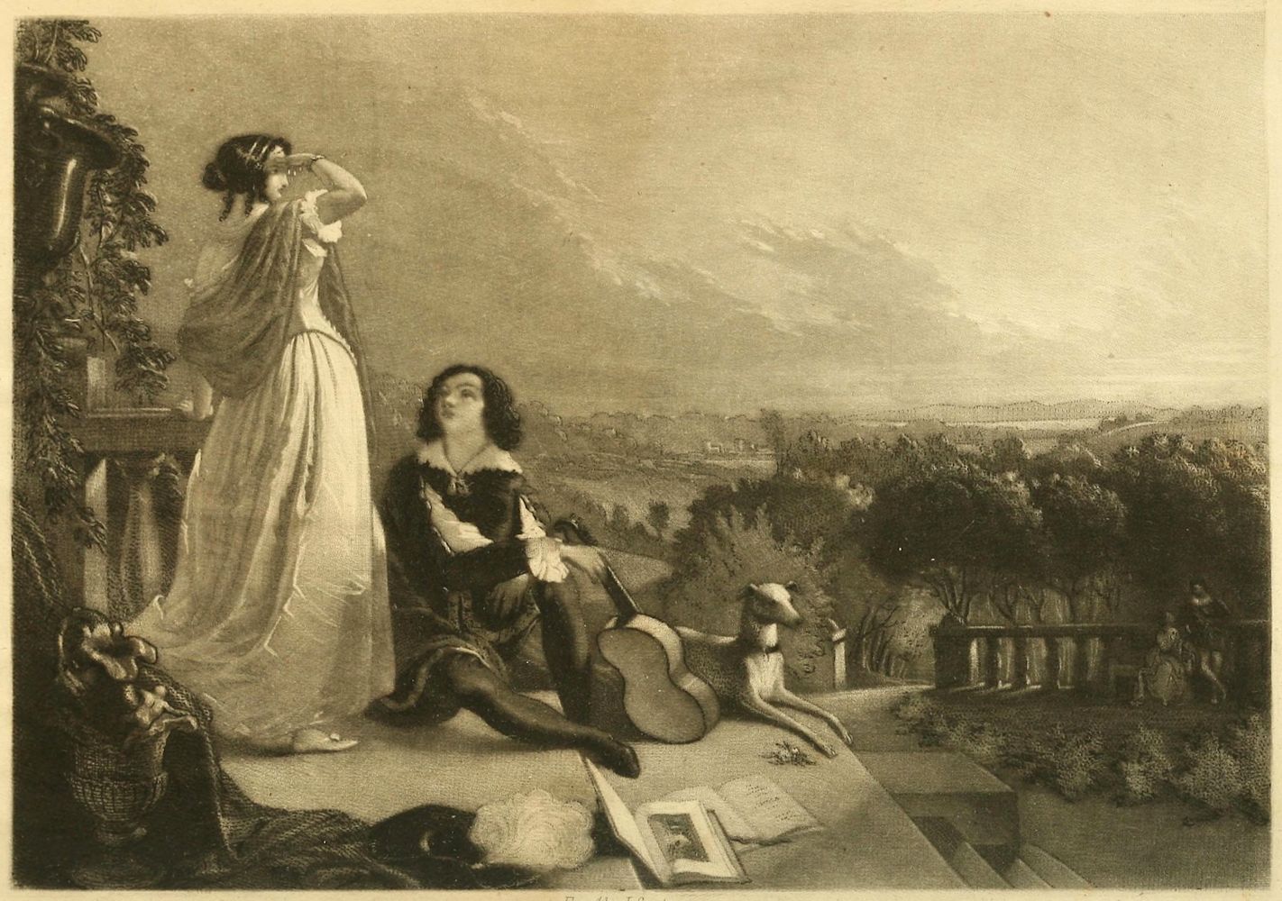 One of these was a youth, just verging into manhood, dressed in a dark, plain suit, with a deep lace collar, and cuffs of the same material. He had apparently been singing, and accompanying himself on the guitar; for his instrument was still held idly in his hand, as he sat at the feet of a lady, into whose face he was looking up with a rapt intensity of gaze, which told that the soul of the page—for such he seemed—was in every glance.