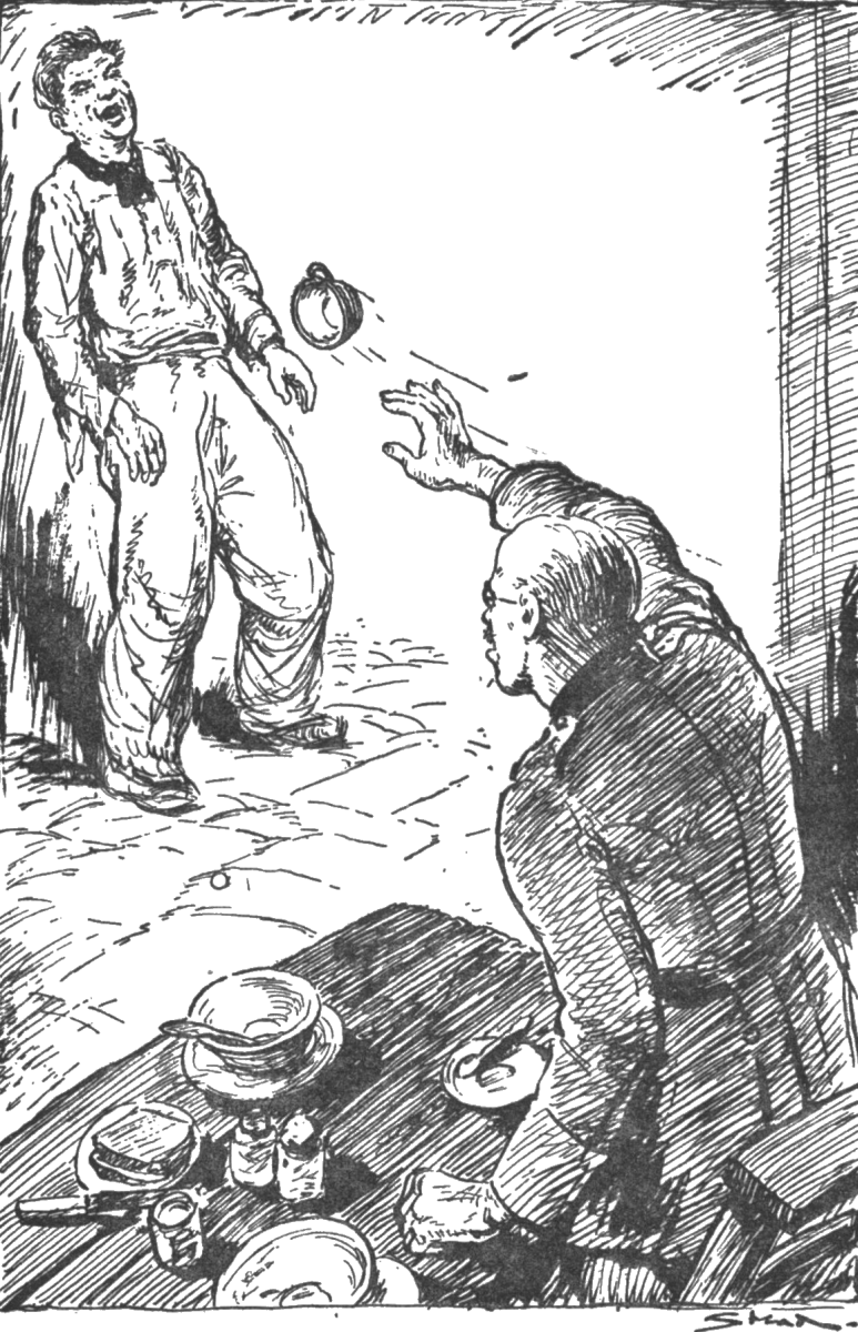 Schaffer swung round, his face was distorted with fury. Snatching up a cup, he hurled it at the half-wit. “Shut up!” he shouted.p. 45