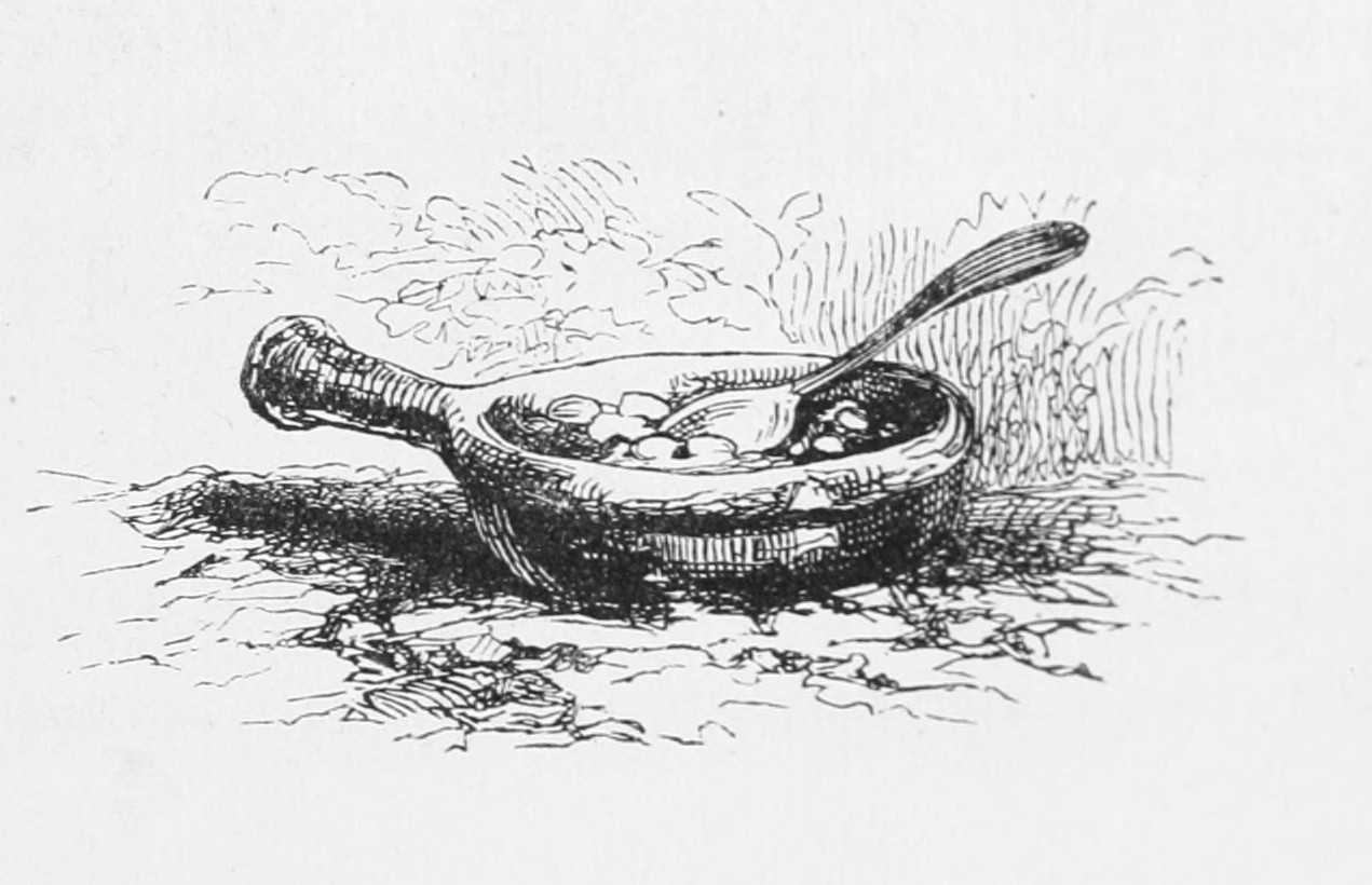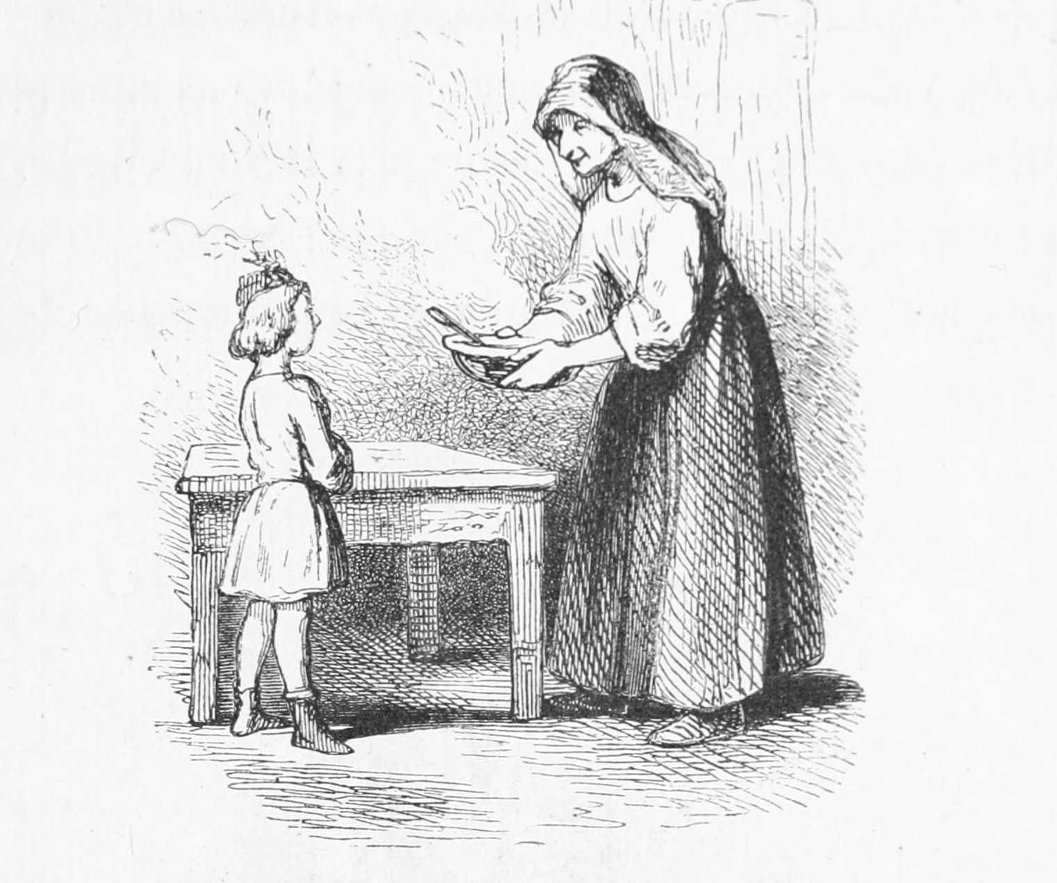 Comme il se disposoit à sortir, afin d’avoir au moins un coup d’œil à donner à ses échaliers avant le réveil de la vieille et du vieux, il rencontra la vieille sur l’huis, qui apportait un bon brouet tout fumant, et le plaça sur sa petite table avec une cuiller de bois: Mange, mange, lui dit-elle, et ne te fais pas faute de ce brouet au miel avec une pointe d’anis vert, comme tu l’aimois quand tu étais encore enfant; car tu as du chemin, mon mignon, et beaucoup de chemin à faire aujourd’hui.