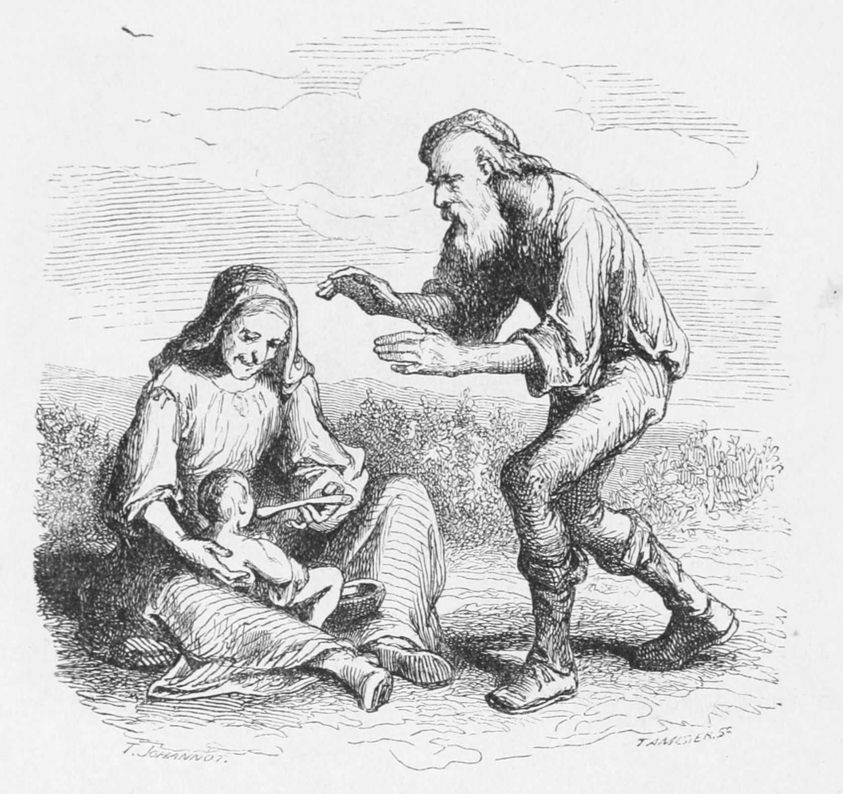 Une fois qu’ils furent rendus au coin de l’âtre, ce fut bien un autre contentement, car le petit leur tendoit les bras avec des rires charmants, et les appeloit maman et papa, comme s’il ne s’en étoit jamais connu d’autres. Le vieux le prit donc sur son genou, et l’y fit sauter doucement, comme