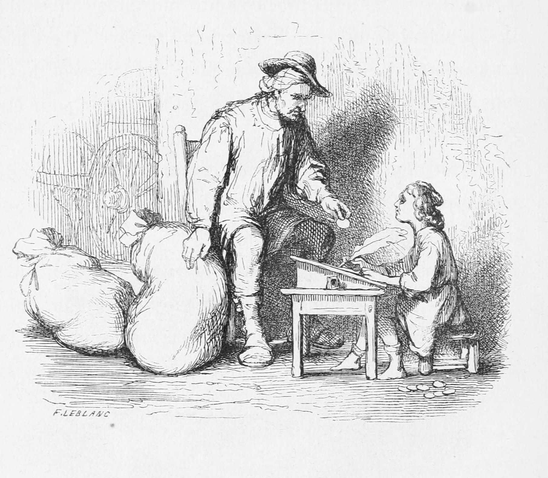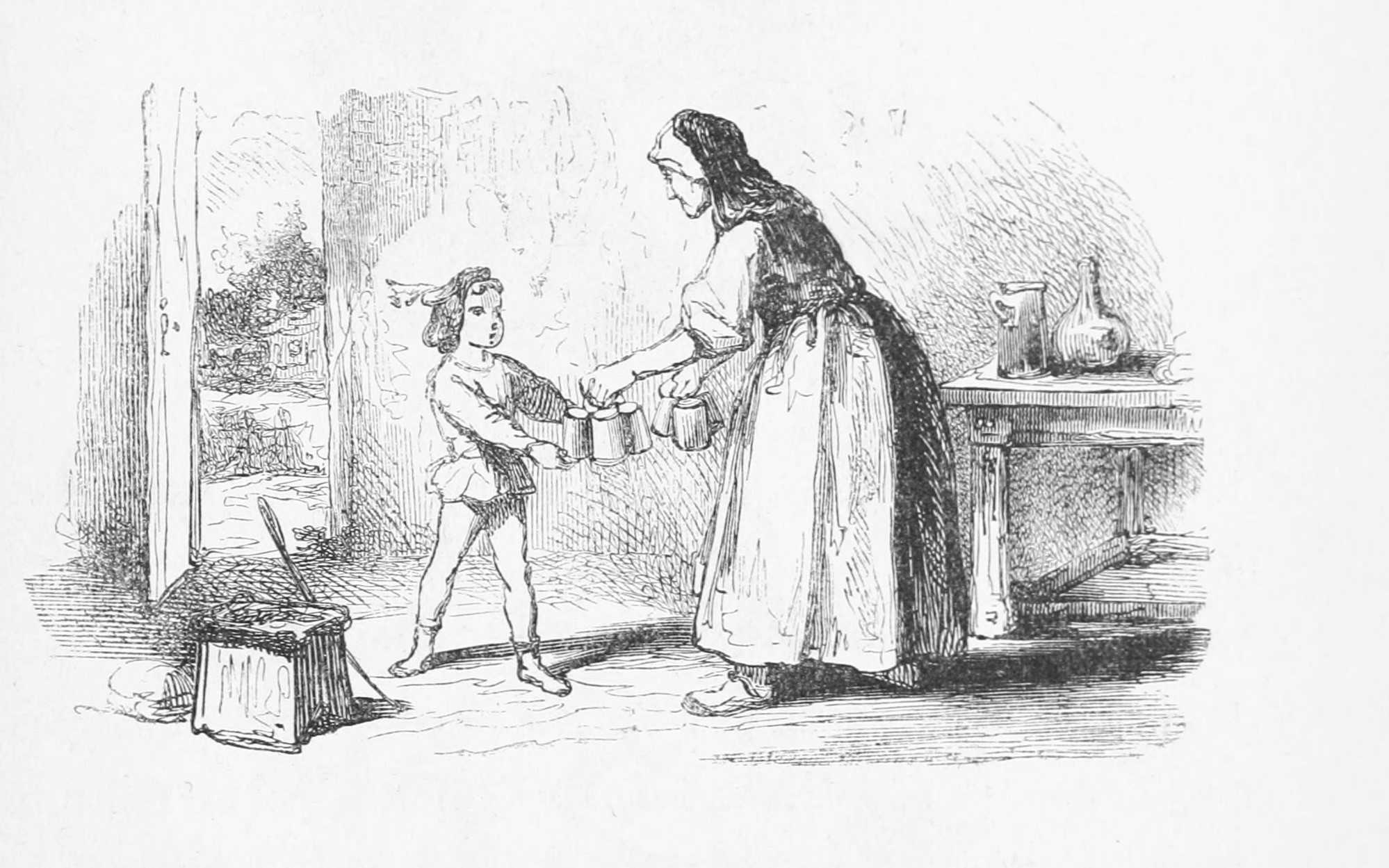 Comme tu connois mieux la valeur des fèves que celle de la monnoie, continua la vieille, tu vendras au marché ces six litrons de fèves choisies à la grande mesure. Je n’en ai pas mis davantage pour ne pas te charger; avec cela, les fèves sont si chères au temps présent, que tu serois bien empêché d’en rapporter le prix, quand on te payeroit tout en or. Aussi nous entendons, ton père et moi, que tu en emploieras moitié à t’ébaudir honnêtement, comme il convient à ton âge, ou en achat de quelques joyaux bien ouvrés, propres à te récréer le dimanche, tels que montres d’argent à breloques de rubis ou d’émeraudes, bilboquets d’ivoire et toupies de Nuremberg. Le reste du montant, tu le verseras à la caisse.