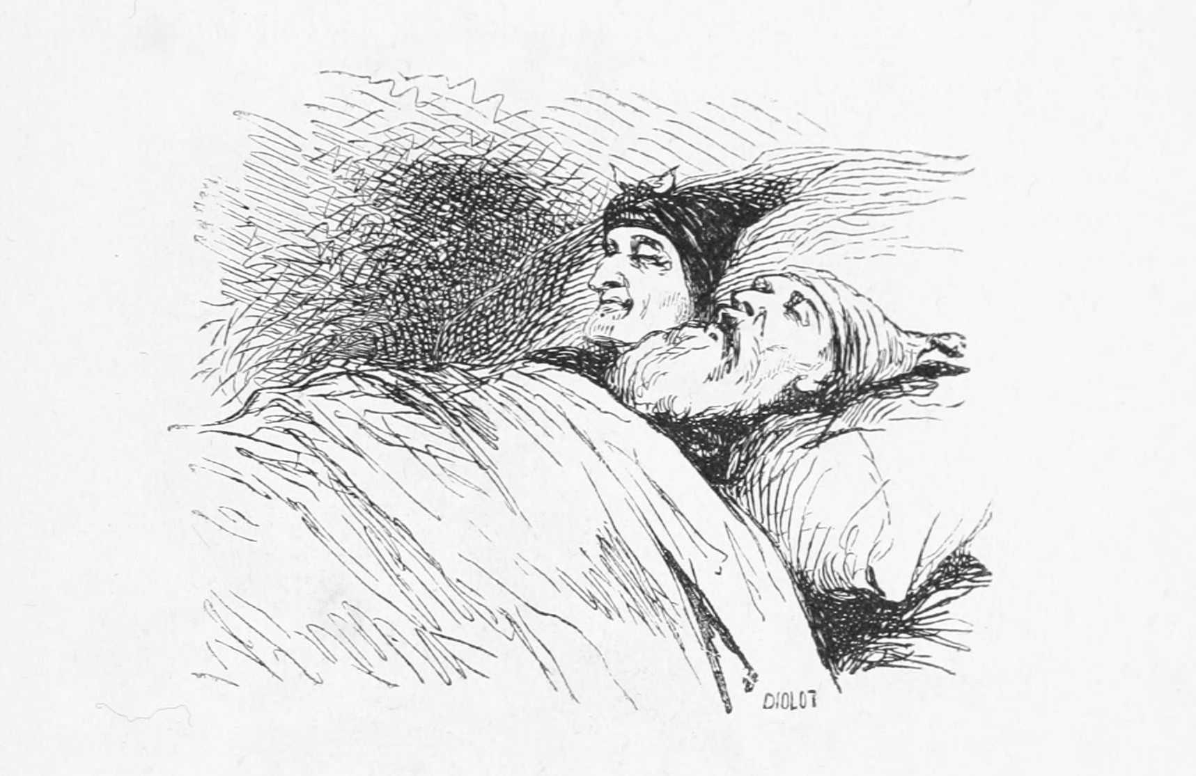 —Fleur des Pois, dit le vieillard en hochant la tête, est bien trop grande princesse pour épouser un pauvre enfant trouvé, qui n’aura vaillant qu’une chaumine et un champ de fèves. Fleur des Pois, ma mie, est un parti pour le sous-préfet ou pour le procureur du roi, et peut-être pour le roi lui-même, s’il devenoit veuf. Nous parlons ici de choses sérieuses, et vous n’êtes pas raisonnable. —Trésor des Fèves l’est plus que nous deux ensemble, répondit la vieille, après avoir un brin réfléchi. C’est d’ailleurs lui que l’affaire concerne, et il seroit de mauvaise grâce de la pousser plus avant sans le consulter.—Là-dessus le vieux et la vieille s’endormirent profondément.