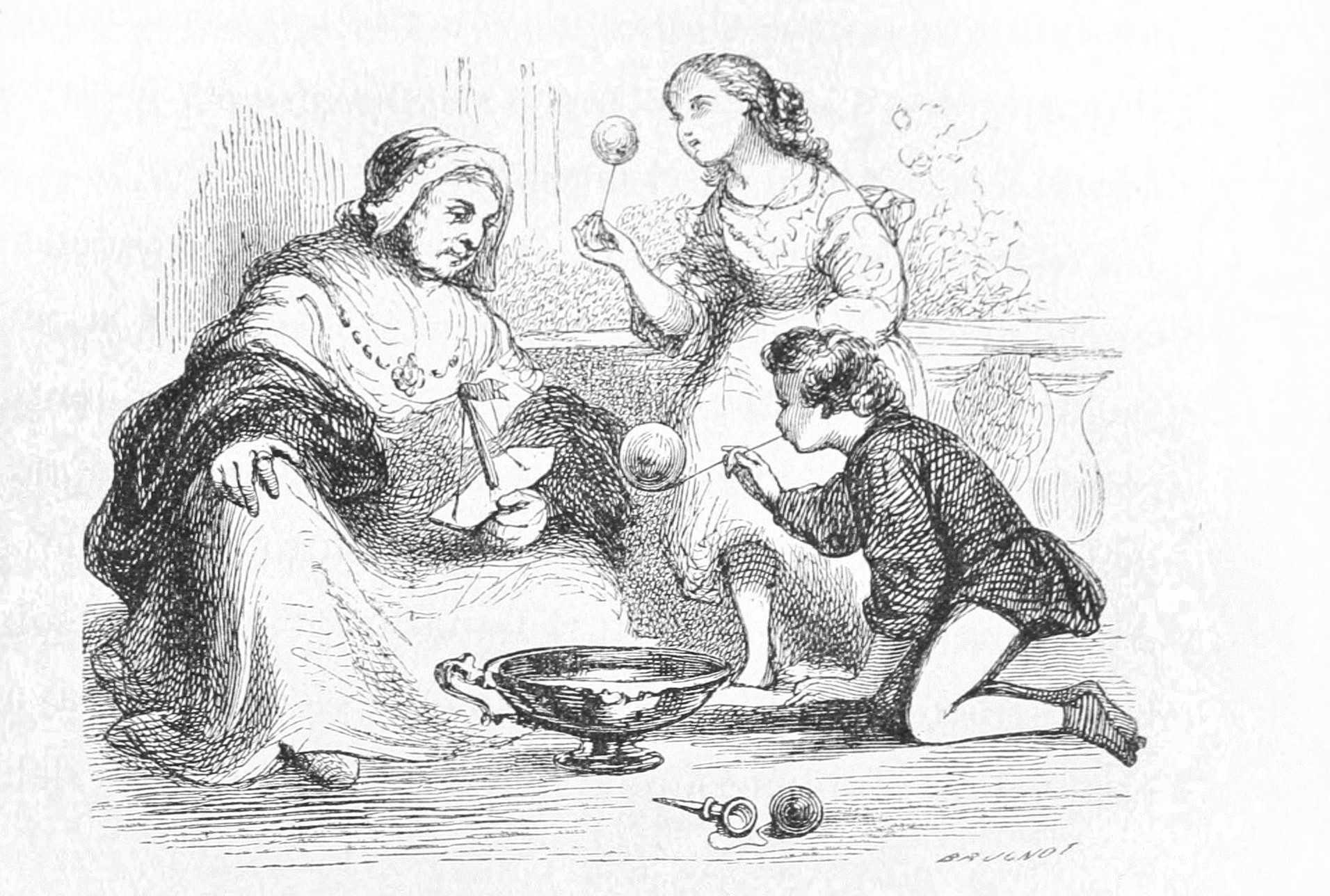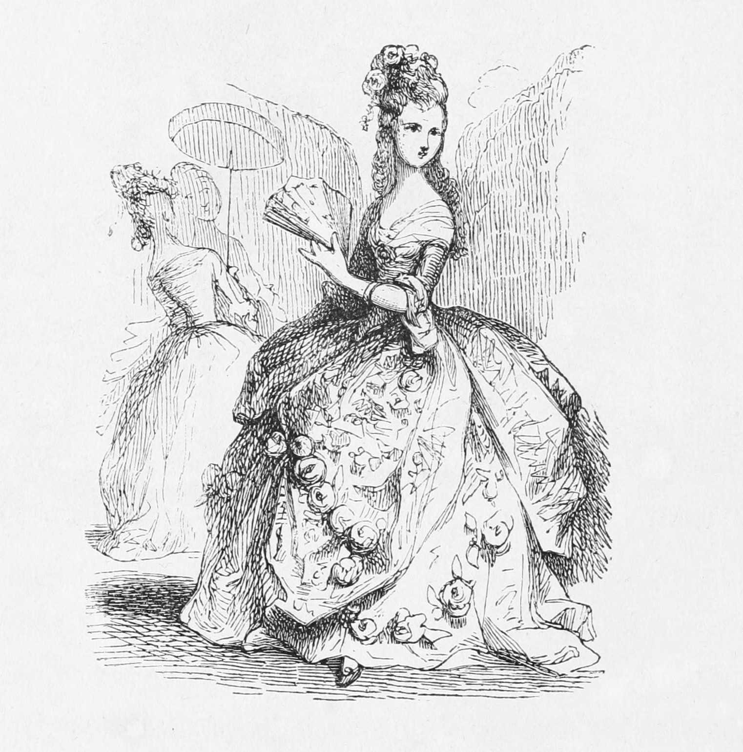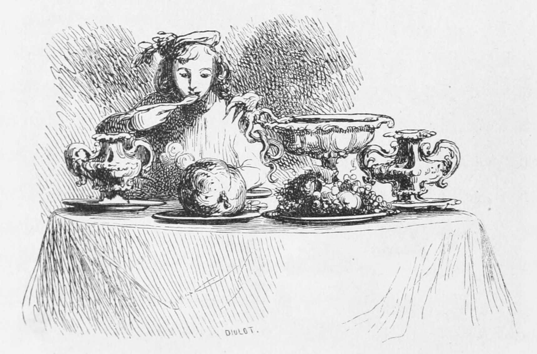 La vieille s’assit sur une escabelle qui étoit là, et, les deux mains sur ses genoux:—Dans le monde, répondit-elle en riant, dans le monde, mon petit trésor! Tu n’as jamais vu que nous, et deux ou trois méchants regrattiers auxquels tu vends tes fèves pour fournir aux dépenses de la maisonnée, digne garçon que tu es; et comme tu dois être un jour un grand monsieur, si le prix des fèves se soutient, il est bon, mon mignon, que tu fasses des connoissances dans la belle société. Il faut te dire qu’il y a une grande ville, à trois quarts de lieue d’ici, où l’on rencontre à chaque pas des seigneurs en habit d’or, et des dames en robe d’argent, avec des bouquets de roses tout autour. Ta jolie petite mine si gracieuse et si éveillée ne manquera pas de les frapper d’admiration; et je serai bien trompée si tu passes le jour sans obtenir quelque profession honorable où l’on gagne beaucoup d’argent sans travailler, à la cour ou dans les bureaux. Mange donc, mange, mignon, et ne te fais pas faute de ce brouet au miel avec une pointe d’anis vert.